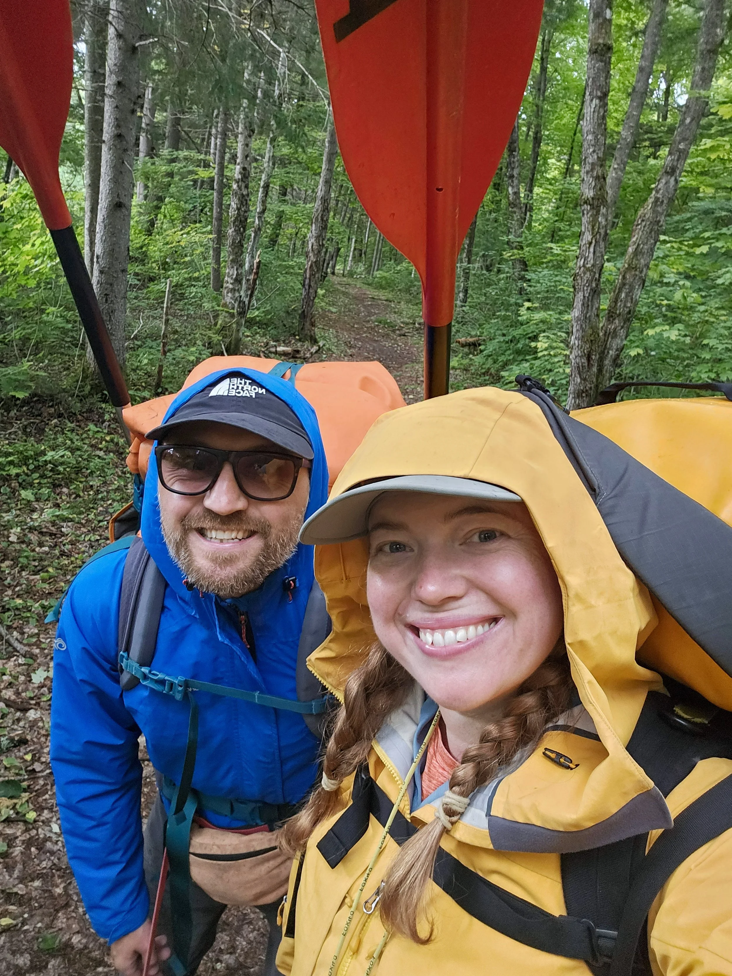 Smiling despite the rain on our final portage to Kiosk on day 8, Algonquin Park, September 2025
